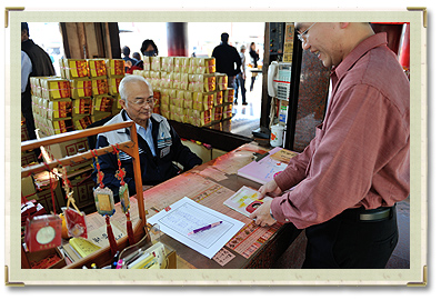 | 得到土地公的許諾後,便可以向紫南宮服務台「求金處」領取「福德 |