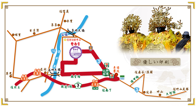 国道 3 数竹山インターチェンジ下 234K →竹山ショー秀傳病院通って左折→リングの足に ( 持っている紫南宫 Q 兆候のバ