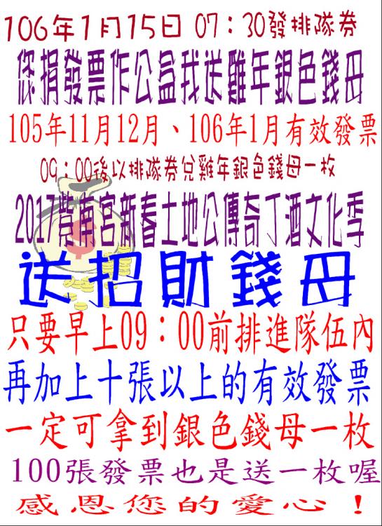2017紫南宮金雞迎新春-土地公傳奇丁酒文化季系列活動-1月15 捐發票送錢母活動規定
