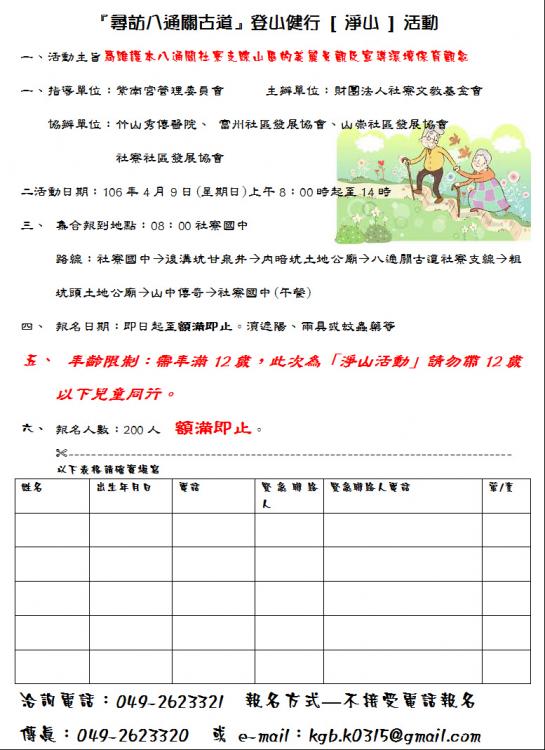『尋訪八通關古道』登山健行 [ 淨山 ] 活動 一、活動主旨為維護本八通關社寮支線山區的美麗景觀及宣導環境保育觀念 一、指導單位:紫南宮管理委員會 主辦單位:財團法人社寮文教基金會 協辦單位:竹山秀傳醫院、富州社區發展協會、山崇社區發展協會 社寮社區發展協會 二活動日期:106年4月9日(星期日)上午8:00時起至14時 三、 集合報到地點:08:00社寮國中 路線:社寮國中Ò後溝坑甘泉井Ò內暗坑土地公廟Ò八通關古道社寮支線Ò粗坑頭土地公廟Ò山中傳奇Ò社寮國中(午餐) 四、 報名日期:即日起至額滿即止。須遮陽、雨具或蚊蟲藥等 五、 年齡限制:需年滿12歲,此次為「淨山活動」請勿帶12歲以下兒童同行。 六、 報名人數:200人 額滿即止。 %------------------------------------------------------------------------------以下表格請確實填寫