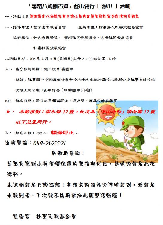 106年4月9日八通關古道健行淨山訊息 『尋訪八通關古道』登山健行 [ 淨山 ] 活動 一、活動主旨為維護本八通關社寮支線山區的美麗景觀及宣導環境保育觀念 一、指導單位:紫南宮管理委員會 主辦單位:財團法人社寮文教基金會 協辦單位:竹山秀傳醫院、富州社區發展協會、山崇社區發展協會 社寮社區發展協會 二活動日期:106年4月9日(星期日)上午8:00時起至14時 三、 集合報到地點:08:00社寮國中 路線:社寮國中Ò後溝坑甘泉井Ò內暗坑土地公廟Ò八通關古道社寮支線Ò粗坑頭土地公廟Ò山中傳奇Ò社寮國中(午餐) 四、 報名日期:即日起至額滿即止。須遮陽、雨具或蚊蟲藥等 五、 年齡限制:需年滿12歲,此次為「淨山活動」請勿帶12歲以下兒童同行。 六、 報名人數:200人 額滿即止。 洽詢電話:049-2623321 感謝再感謝! 感恩大家對山林環境保護的重視與付出,熱情的報名此次活動。 本活動報名已額滿囉!有報名的請務必準時報到,若報名未報到者,下次就不能再參加此類型活動囉!
