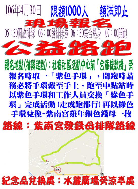 | 2017年紫南宮金雞迎新春-土地公傳奇丁酒文化季系列活動之 4/30公益路跑及闖關遊戲活動內容公告: | 2017-04-21 16:20:48 | |||||||||||