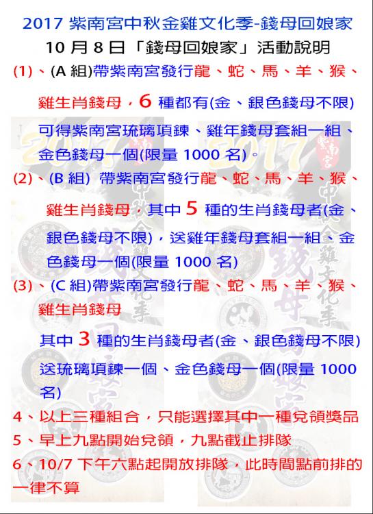 2017紫南宮中秋金雞文化季-錢母回娘家系列活動-10/8「錢母回娘家 」活動說明: