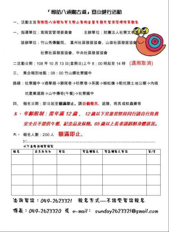 108年金雞文化季系列活動- 10月13日八通關古道社寮聯絡道登山健行活動報名訊息: