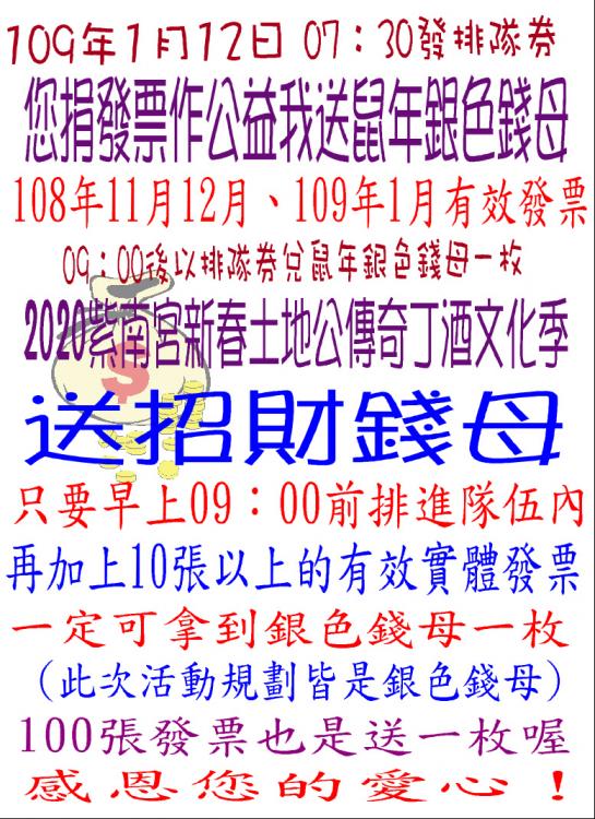 2020紫南宮丁酒文化季系列活動之1月12日捐發票排隊送錢母