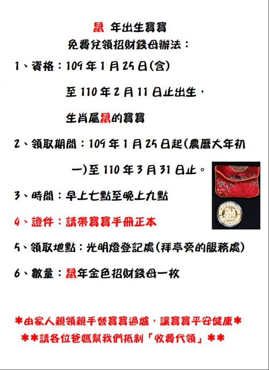 鼠 年出生寶寶 免費兌領招財錢母辦法: