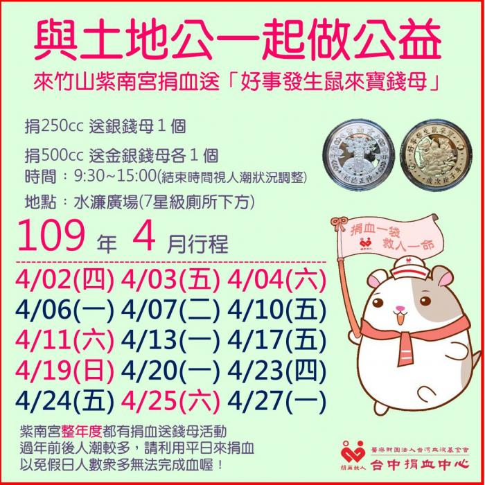 紫南宮整年度都有捐血送錢母活動 過年前後人潮較多,請利用平日來捐血 以免假日人數眾多無法完成捐血喔! 時間:9:30-15:00(結束時間視人潮狀況調整) **『請用手機搜尋LINE愛捐血官方帳號,您就可以用關鍵字直接查詢下次可捐日期、檢驗報告、捐血紀錄證明、預約捐血、預填健康問券、捐血活動資訊、捐血疑問、暫緩捐血項目(疫苗、醫美及注射、藥物、手術、牙齒治療、疾病、感染危險區....等),方便又快速。』 **捐血相關規定太多,無法一一列表告知,捐血前請先查詢,以免白跑一趟。