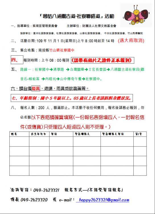 2020紫南宮金雞文化季系列活動-11月1日八通關古道社寮段登山健行活動報名訊息…
