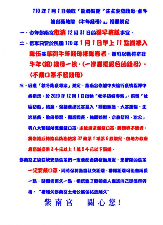 | 2021紫南宮牛年錢母發放訊息 | 2020-12-27 12:15:05 |