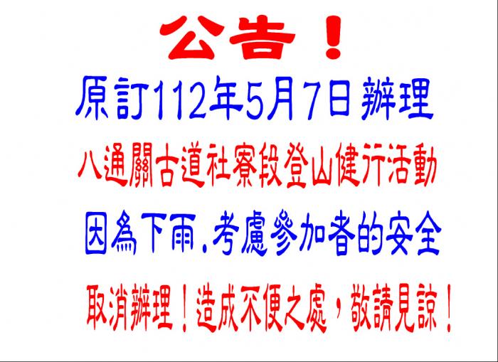 112/5/7八通關古道社寮段登山健行活動取消公告