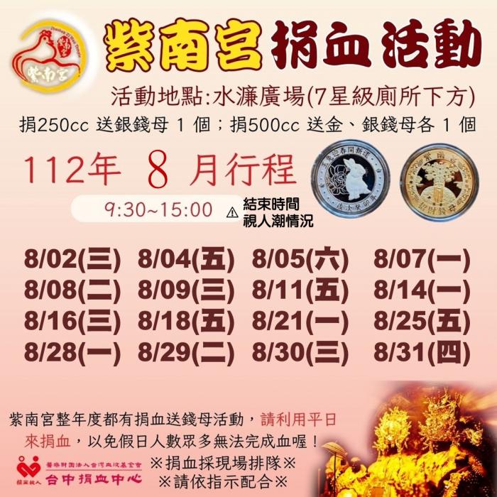 謝謝您的愛心,因台中捐血中心的捐血車及人力資源有限,需要分配到台中、彰化、雲林、南投4個縣市,難免假日排不到捐血車,捐血中心若假日有捐血車,一定會安排來紫南宮,因為他們知道有太多像您一樣滿腔熱血的信眾等著要奉獻自己的愛心熱血。