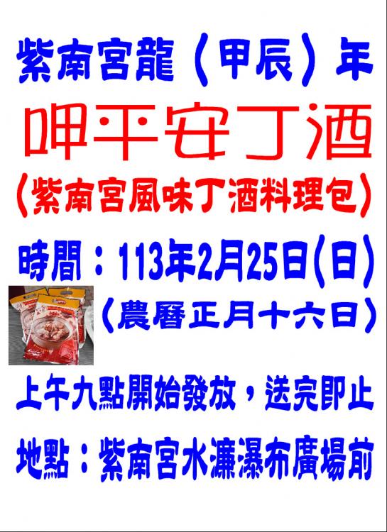 | 紫南宮龍(甲辰)年 呷平安丁酒活動新聞稿 | 2024-02-19 15:04:40 |