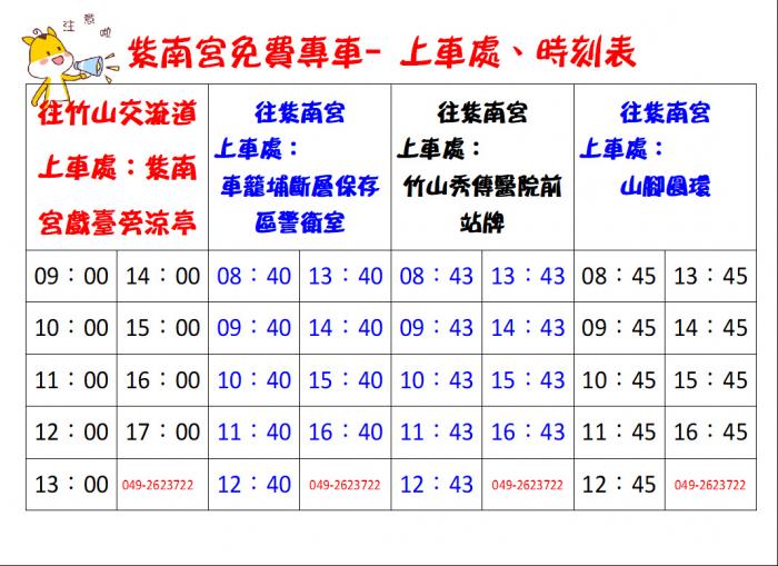 紫南宮免費接駁車上車處及時刻表: