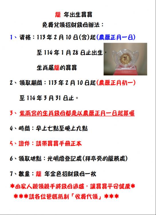 近日有多位準媽媽帶著媽媽手冊前來紫南宮欲領取招財錢母,紫南宮此聲明,請於寶寶出生後再憑「兒童手冊」領取當年度招財錢母,勿聽信網路不實流言。