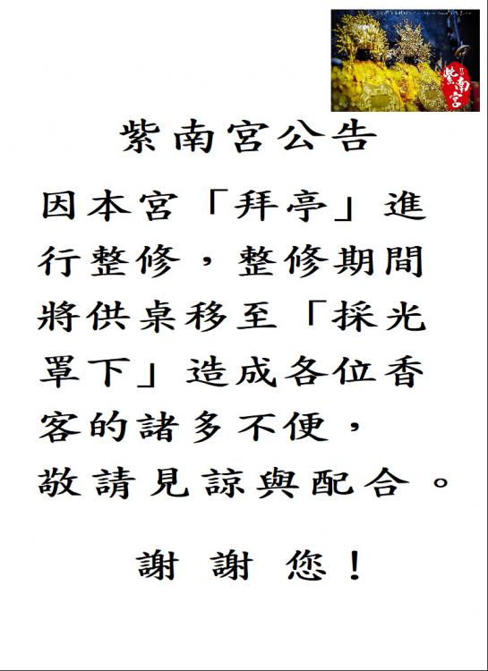 紫南宮近期因整修「拜亭」,暫時將供桌移至「採光罩下」(拜亭服務處的前面),維期3-4週,造成各位香客的不便之處,敬請見諒與配合,謝謝您!