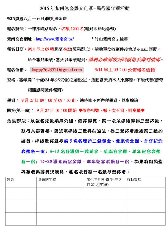 2015紫南宮中秋金雞文化季-9/27擲筊金雞報名開始囉----請詳閱