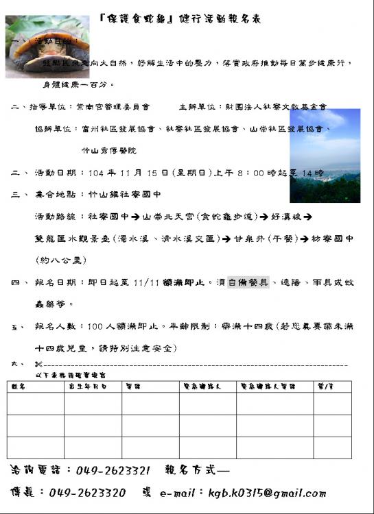 2015紫南宮中秋金雞文化季---11/15保護食蛇龜健行活動開始報名囉