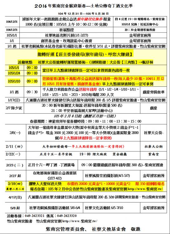 眾所矚目之「2016紫南宮金猴迎新春-土地公傳奇丁酒文化季」活動節表出爐囉!