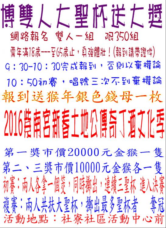 | 2016紫南宮金猴迎新春-土地公傳奇丁酒文化季系列活動-擲雙人大聖杯報名訊息 | 2016-02-18 10:21:05 | |||||||||||||||
