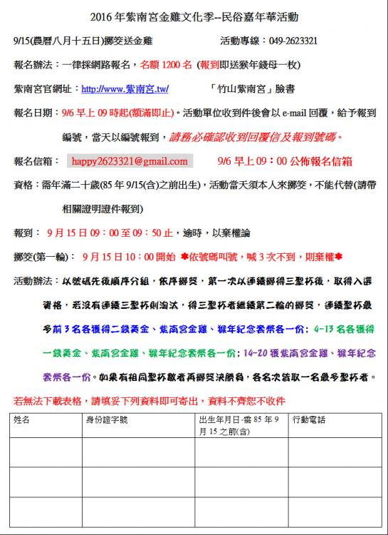 2016紫南宮中秋節金雞文化季活動 擲筊送金雞報名辦法--
