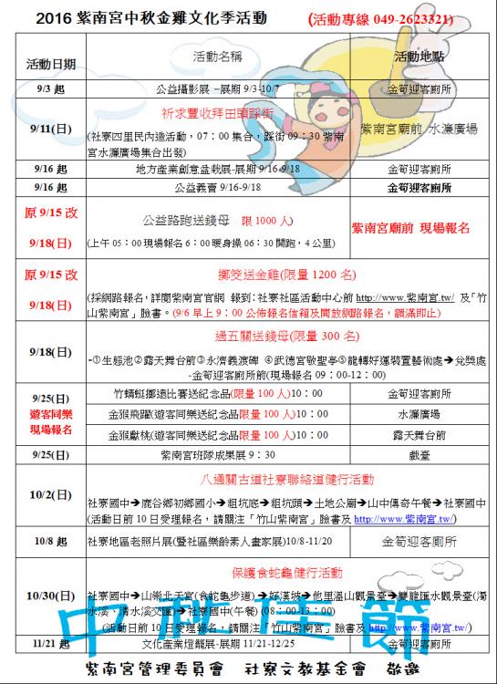 因「莫蘭蒂颱風」來襲,原訂9/15日(四)的「公益路跑送錢母」及「擲筊送金雞」活動順延至9/18日(日),時間與流程不變。請參閱新的節目表